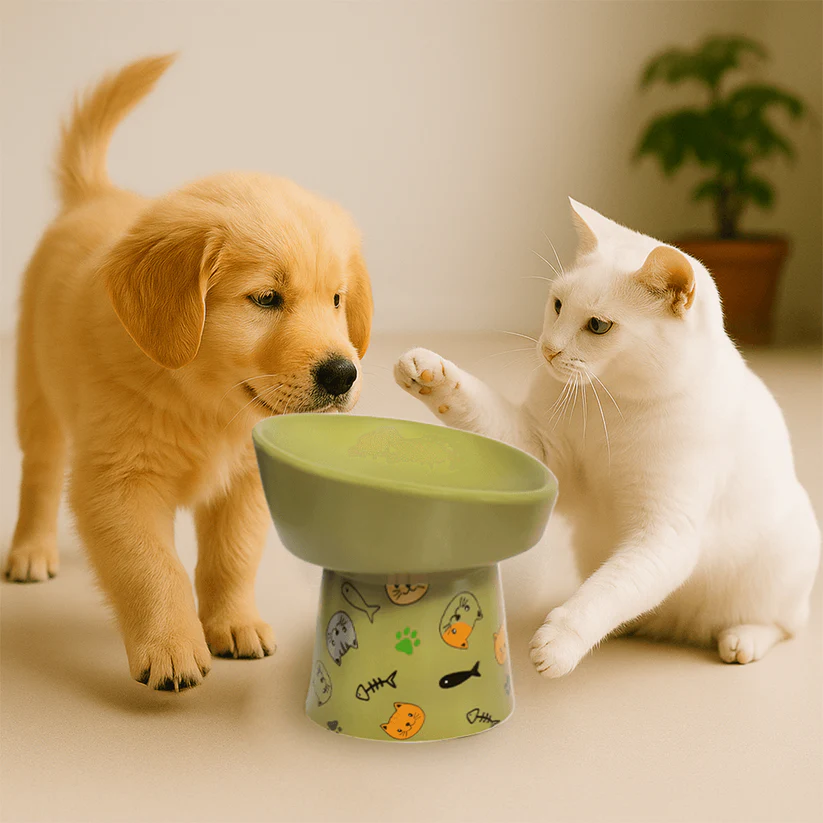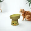 Premium, ceramic elevated cat food bowls in a serene Olive finish, designed to appeal to owners seeking a natural aesthetic without compromising on pet wellness. Its veterinary-approved raised design promotes healthy digestion while blending seamlessly with organic and modern home decor.