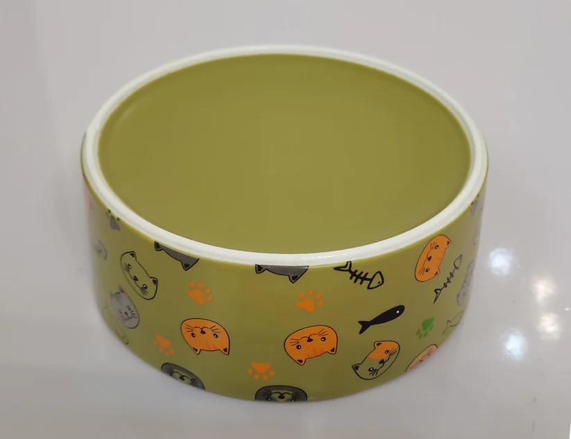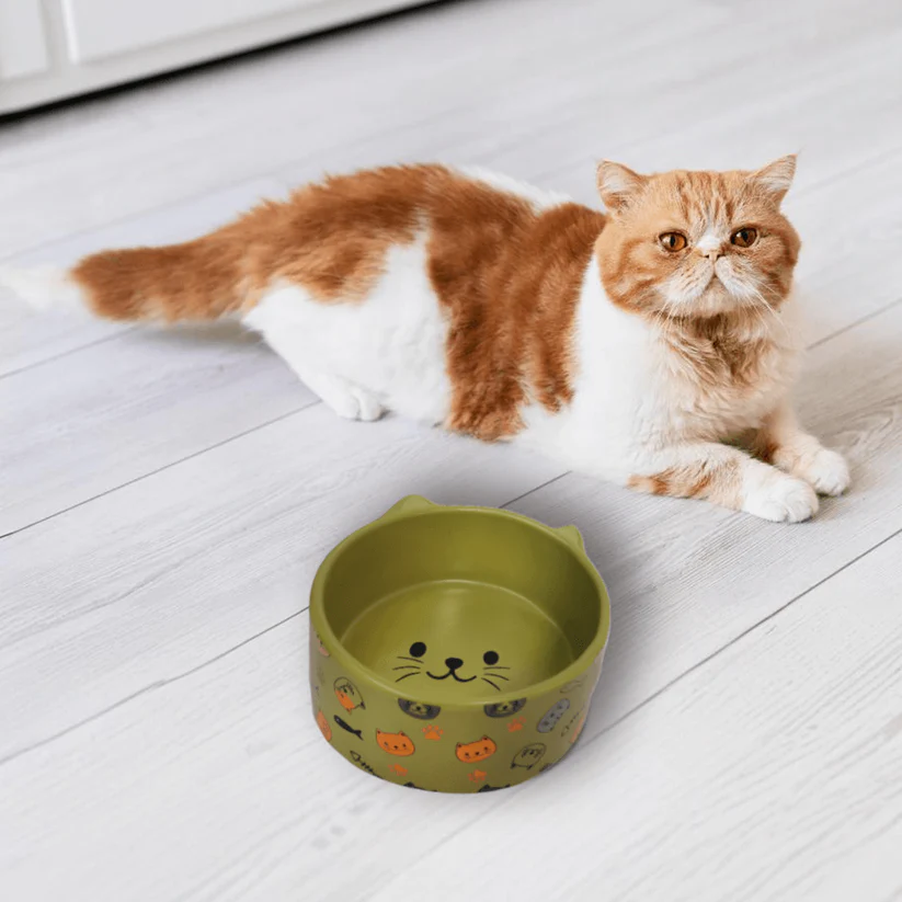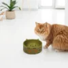 A specialized 5-inch stoneware bowl designed specifically for cats, featuring a low-profile, whisker-friendly design and a weighted base. The earthy Olive finish caters to eco-conscious consumers and complements rustic or natural home decor styles.